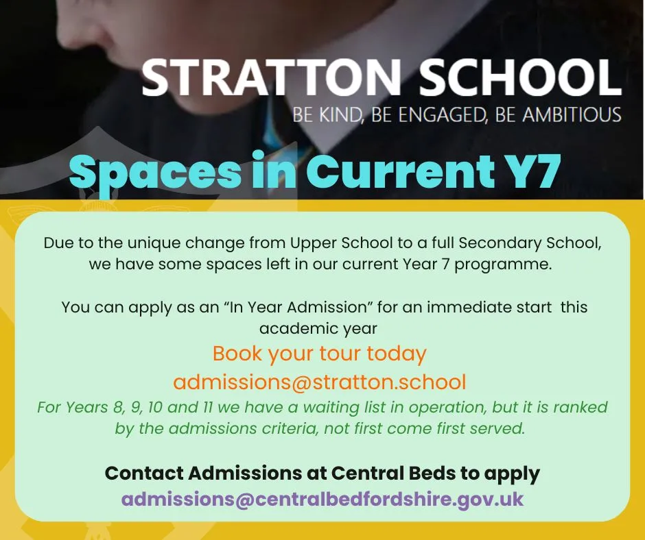 Whether you're applying for Year 7, considering an in-year transfer, or exploring our Matt King Sixth Form, there's never been a better time to join Stratton. With our enhanced facilities, strong pastoral care, and a vibrant learning environment, Stratton School is the place to be.